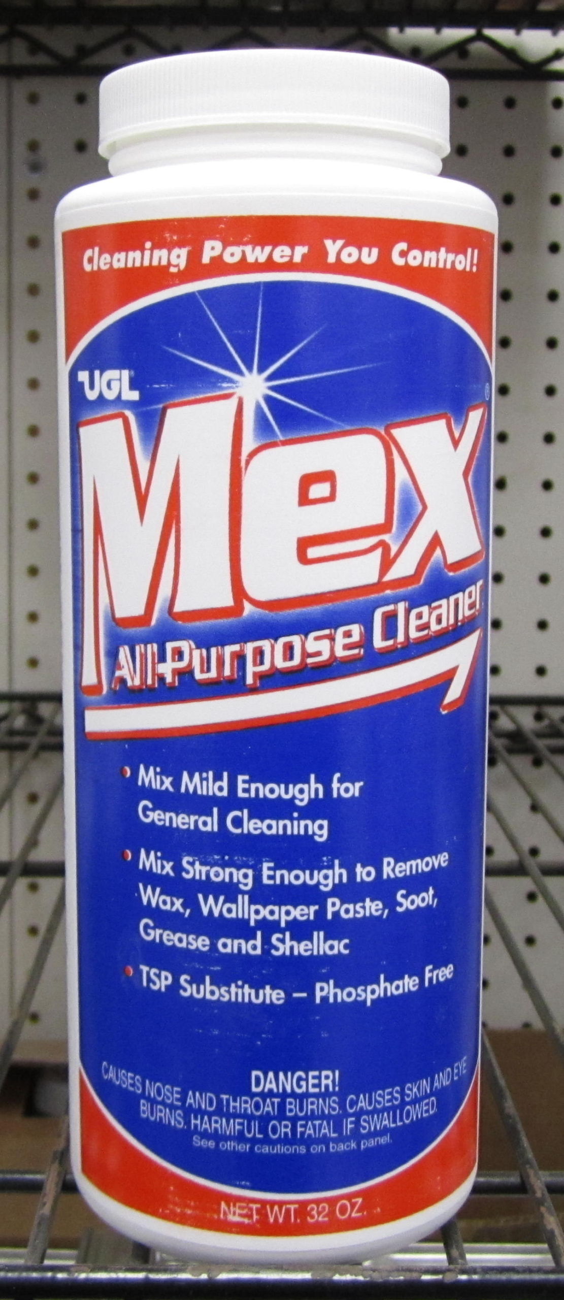 MEX by UGL is a phosphate-free cleaning powder for use in the home, garage or workshop. It mixes with water to any desired strength. MEX is excellent for removing shellac, grease, wax, dirt and soot from masonry, wood floors, patios, grills, plumbing fixtures, appliances, etc. It also cleans soot and smoke stains from brick and stone fireplaces and hearths.